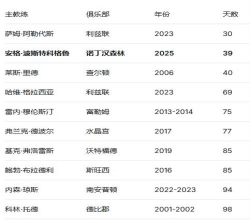 39天,0胜,20个失球,联赛第17位的阴影……这些冰冷的数据宣告了森林队史上最短命主帅的诞生。
