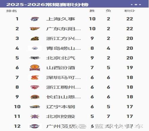 卫冕冠军广厦队,他们的8连胜纪录已经被终结了,目前,广厦的战绩是9胜2负,依旧保持非常强的竞争力。不过,由于少赛一轮的缘故,他们在排名上稍微吃亏,暂时只能屈居积分榜第三名。而排在积分榜第四名的是青岛队,他们目前的战绩是8胜4负。作为本赛季第一争冠热门球队,北京队则排在积分榜第5名,他们的战绩为9胜2负。不过,和广厦一样,北京队同样少赛一场,在排名上稍微吃亏。