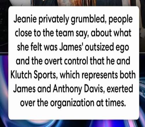 “珍妮以背叛身边人和球队功勋而出名,对杰里·韦斯特如此,对自己的哥哥吉姆也是如此,现在她甚至开始背叛湖人当家勒布朗·詹姆斯。”